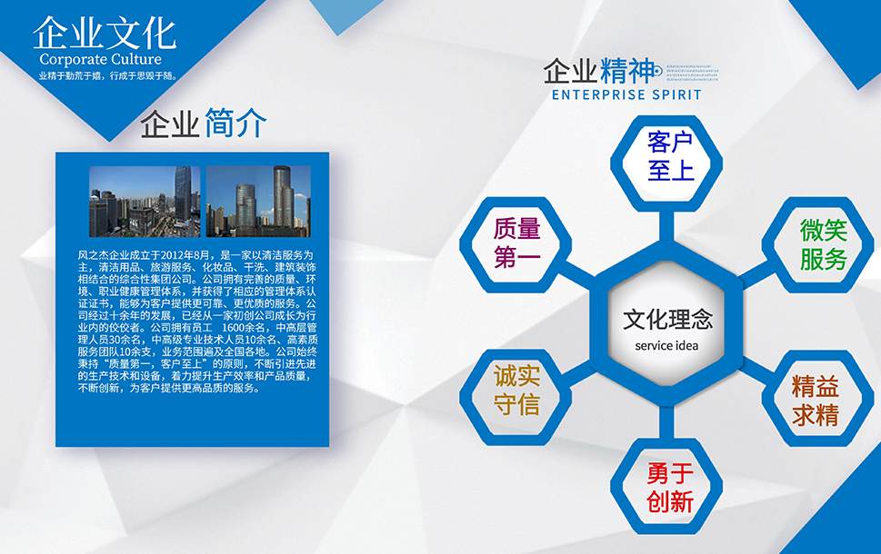 公司是一家以清潔服務(wù)為主,旅游,干洗、化妝品、裝修和餐飲相結(jié)合的多元化發(fā)展運(yùn)營(yíng)的服務(wù)性企業(yè)。企業(yè)本著誠信第一、服務(wù)至上的原則,依靠公司盡我所能、力我所及的信條從2012年到現(xiàn)在服務(wù)了多家企業(yè),現(xiàn)在我們已經(jīng)擁有了400家左右的清潔服務(wù)項(xiàng)目和多家洗衣店。我們會(huì)一直牢記服務(wù),創(chuàng)新才是我們企業(yè)發(fā)展的服務(wù)宗旨。